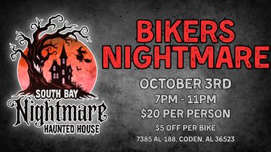 Rev up your Halloween spirit—Bikers Nightmare roars into South Bay Nightmare! 🏍️ Decorated motorcycles, eerie riders, and candy for the brave make this a night you won’t forget.
