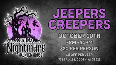 Calling all Jeep enthusiasts! Show off your jeeps, get $5 off per Jeep, and brave the night as you navigate the halls of South Bay Nightmare. Will you and your crew survive?